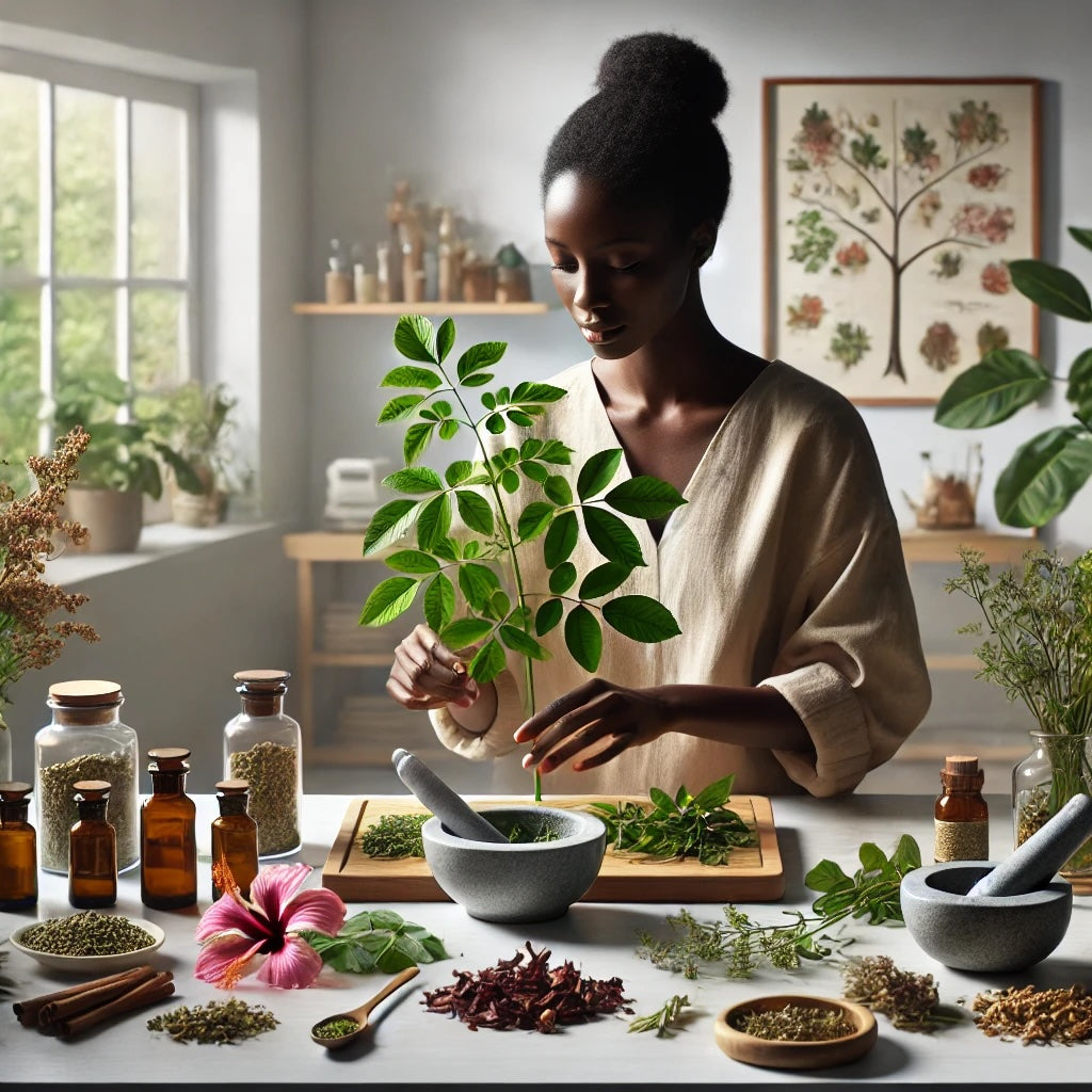 Intègre les plantes médicinales africaines (moringa, neem, kinkéliba, bissap…).